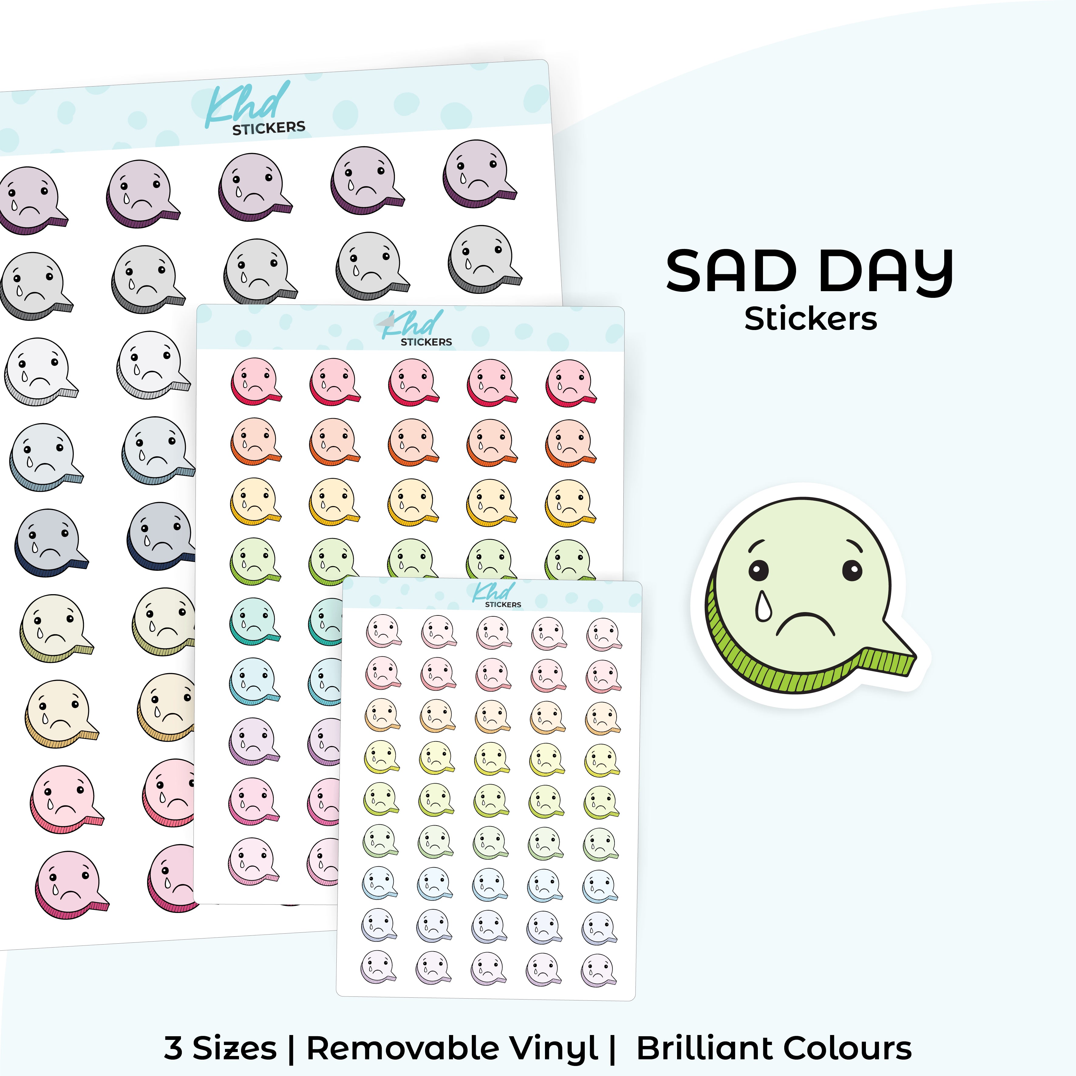 Sad Day Planner Stickers. Select from one of 4 colourways, or select a sheet of your favourite colour. Available in three great sizes making it easy to match your planning style.