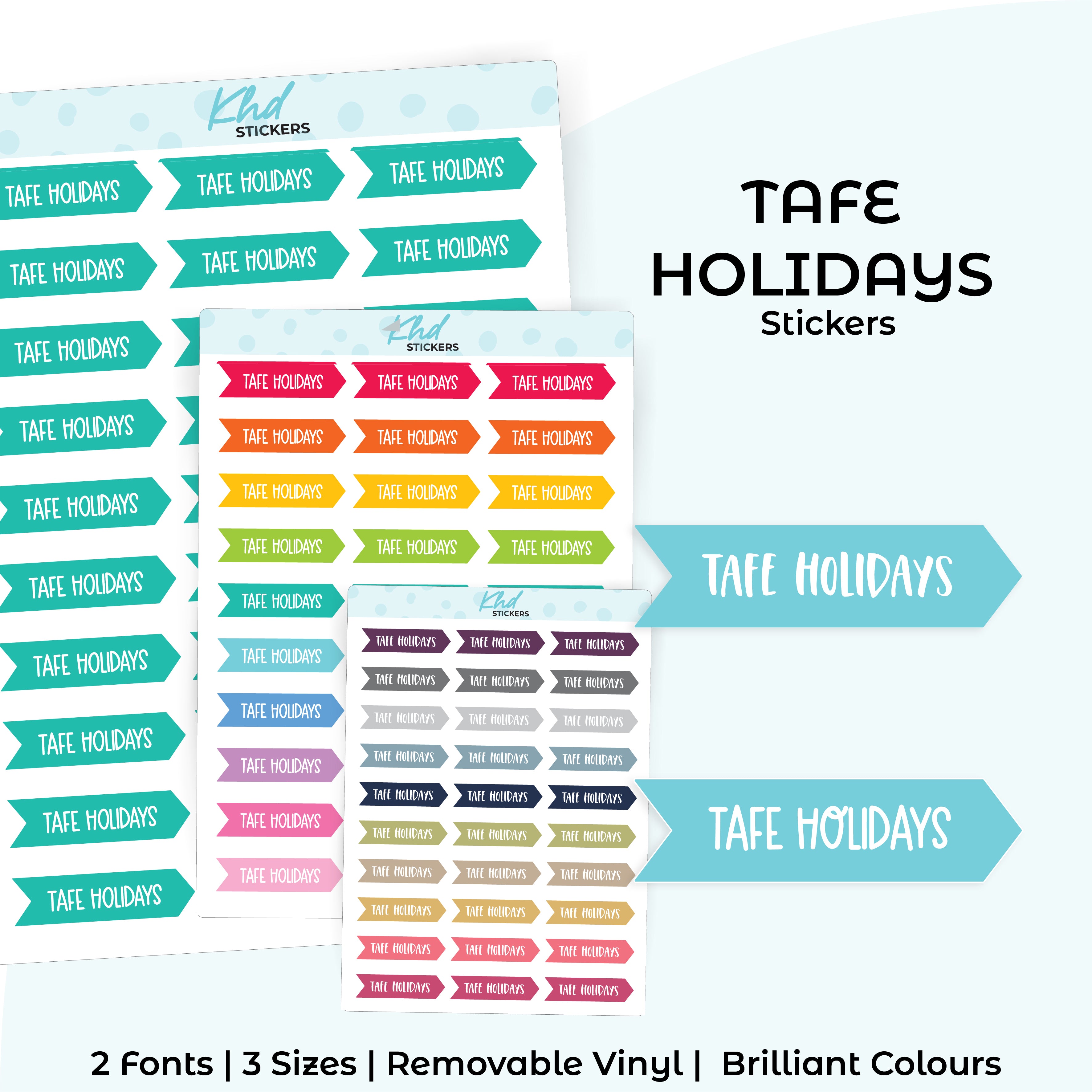 TAFE Holidays Planner Stickers. Select from one of 4 colourways, or select a sheet of your favourite colour. Available in three great sizes making it easy to match your planning style.