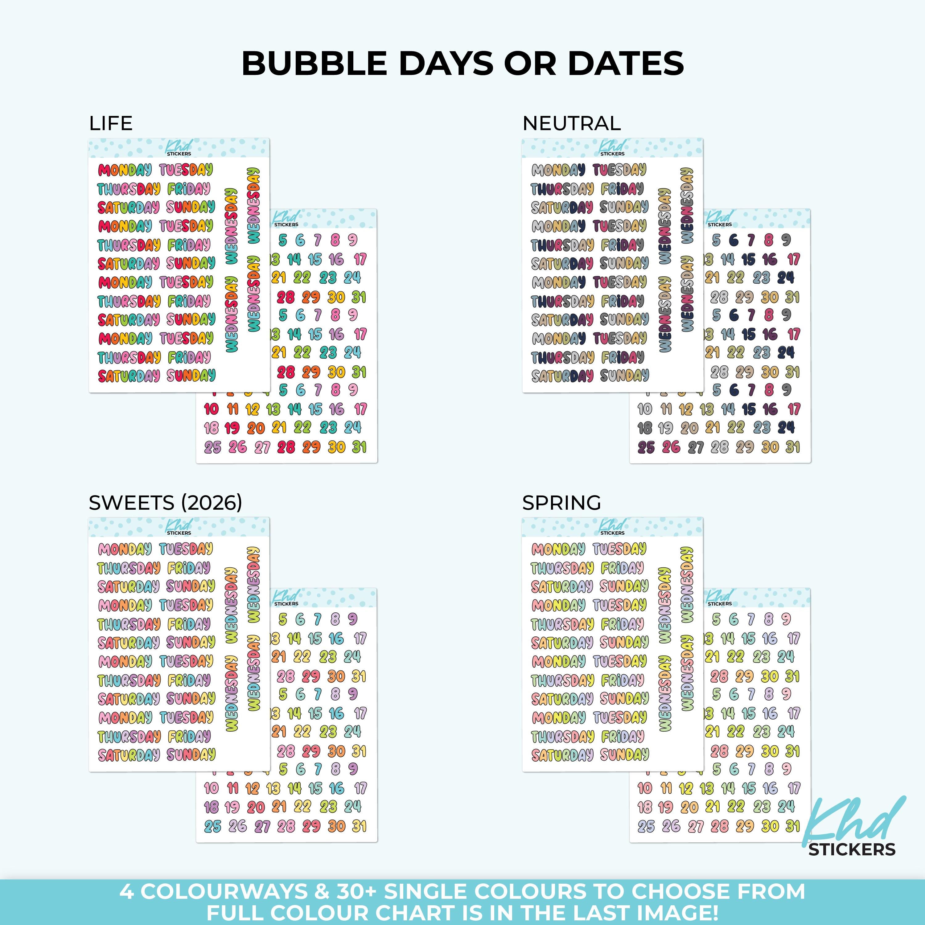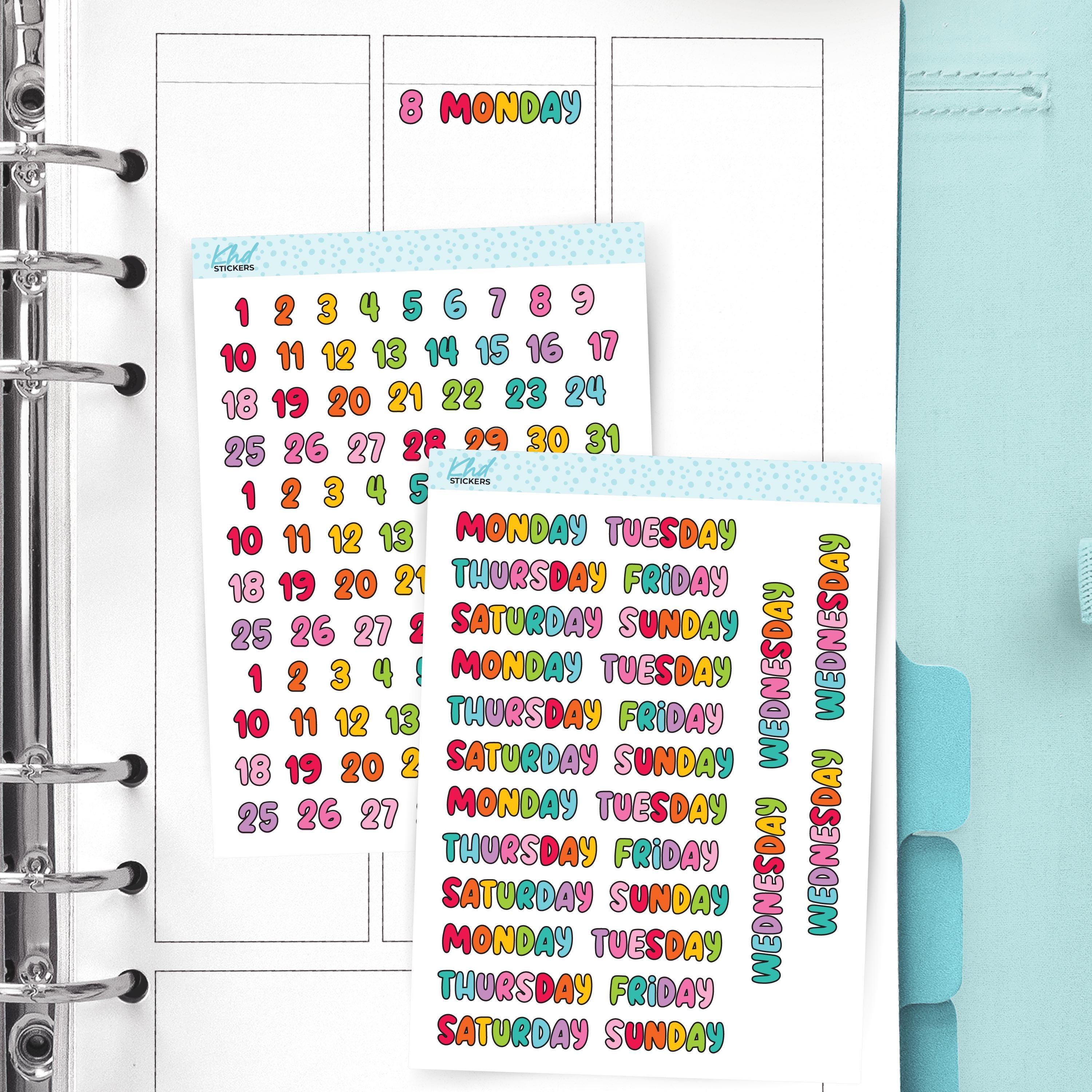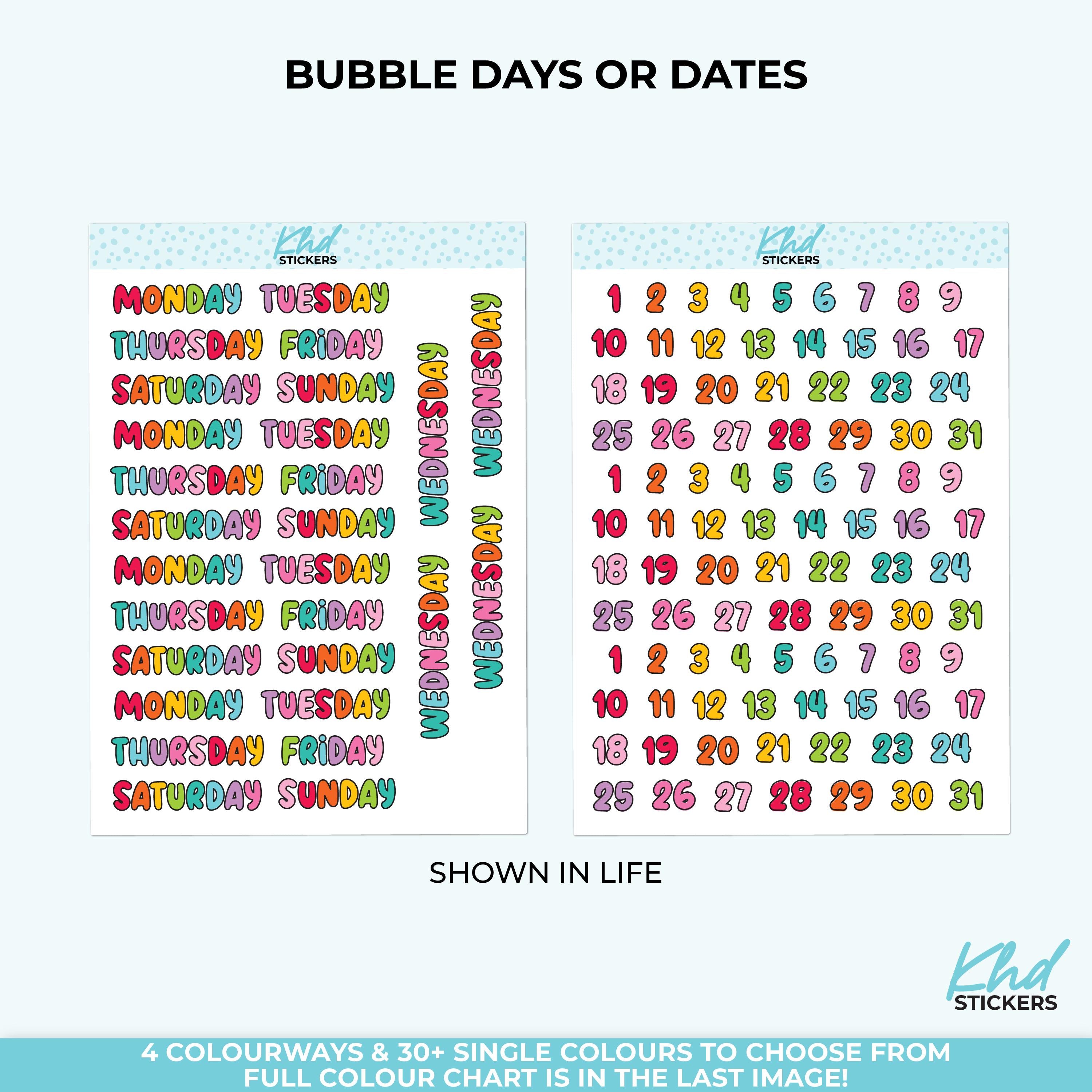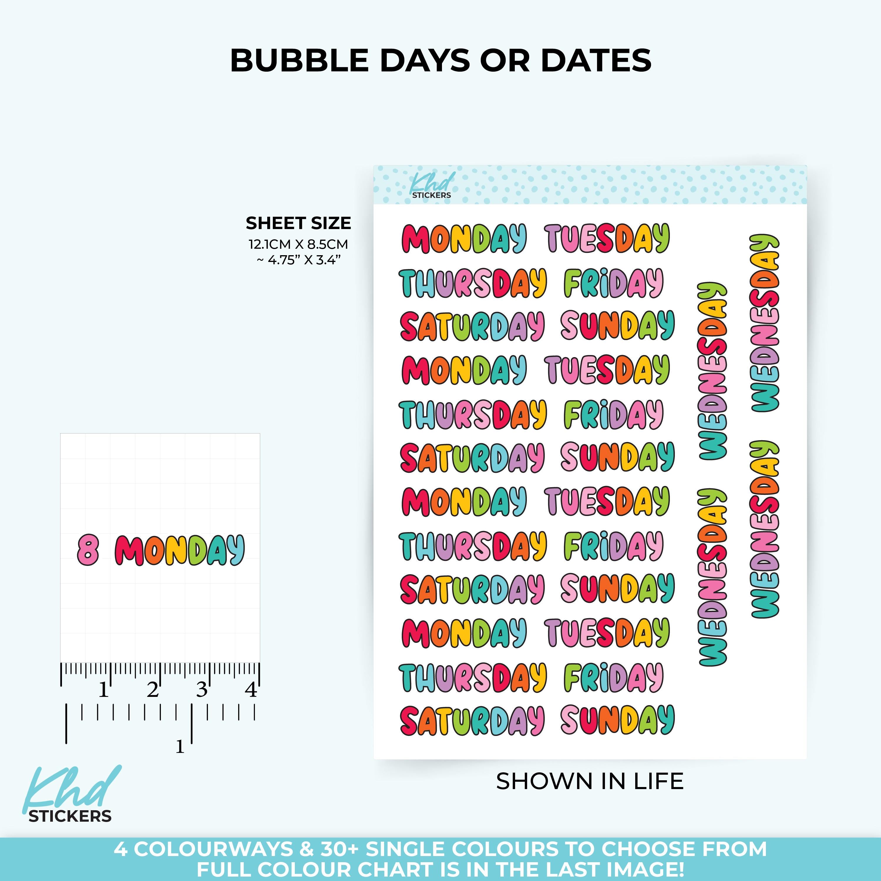 Bright and colourful days of the week and bubble numbers stickers. Fun bubbles in a mix of colours, or perhaps select a sheet of your favourite colour. All letters and numbers have a black border. The cut line follows the number/day, and is not circular.