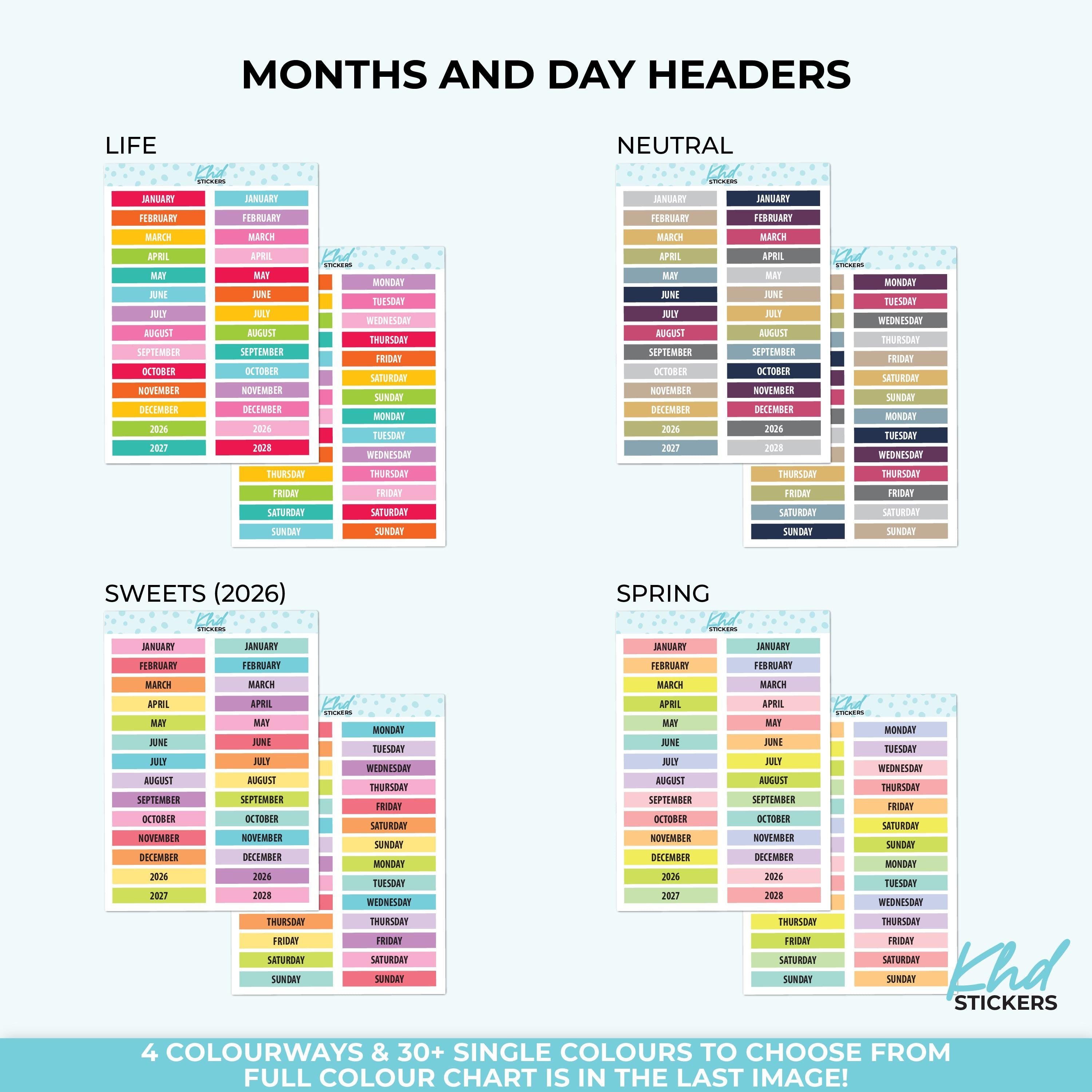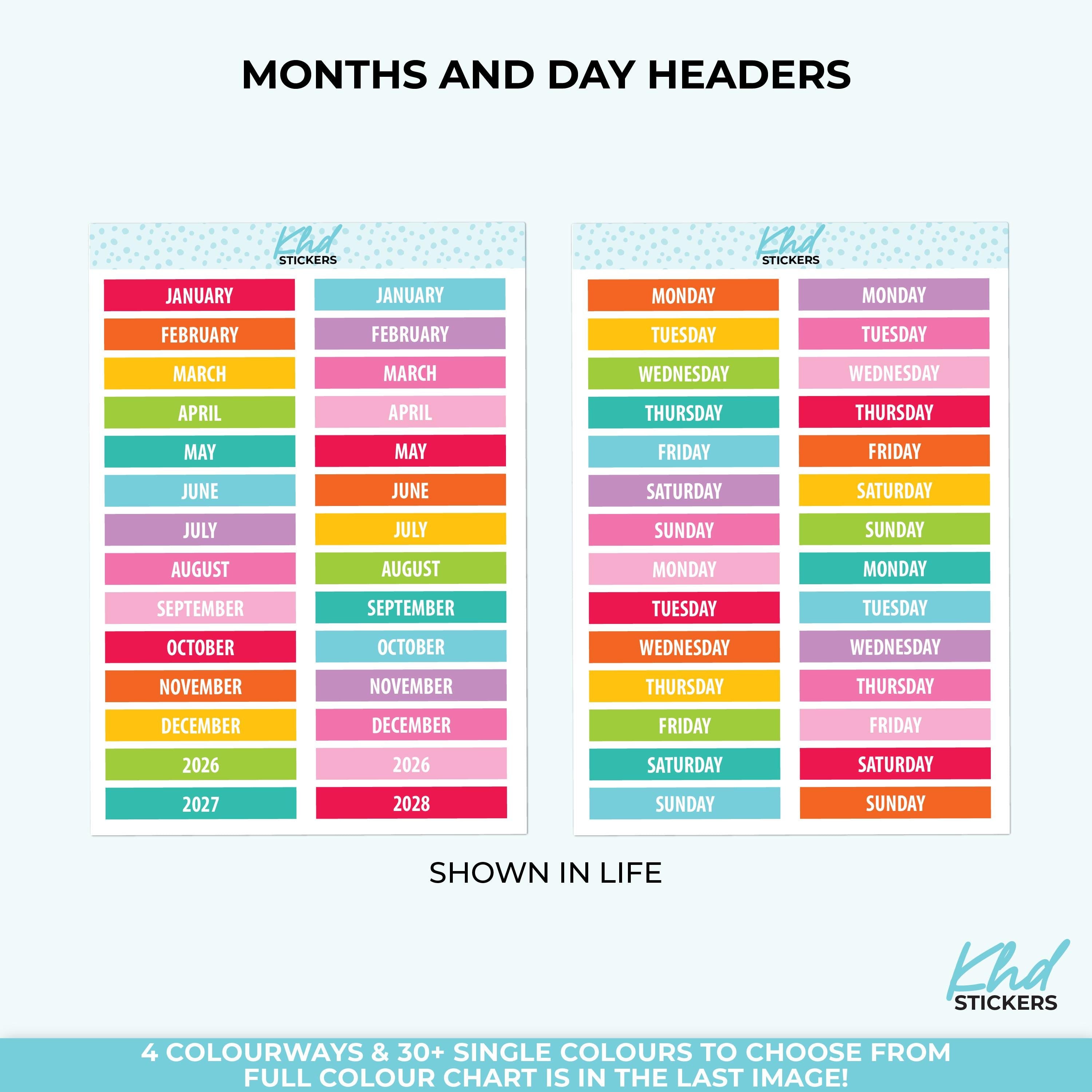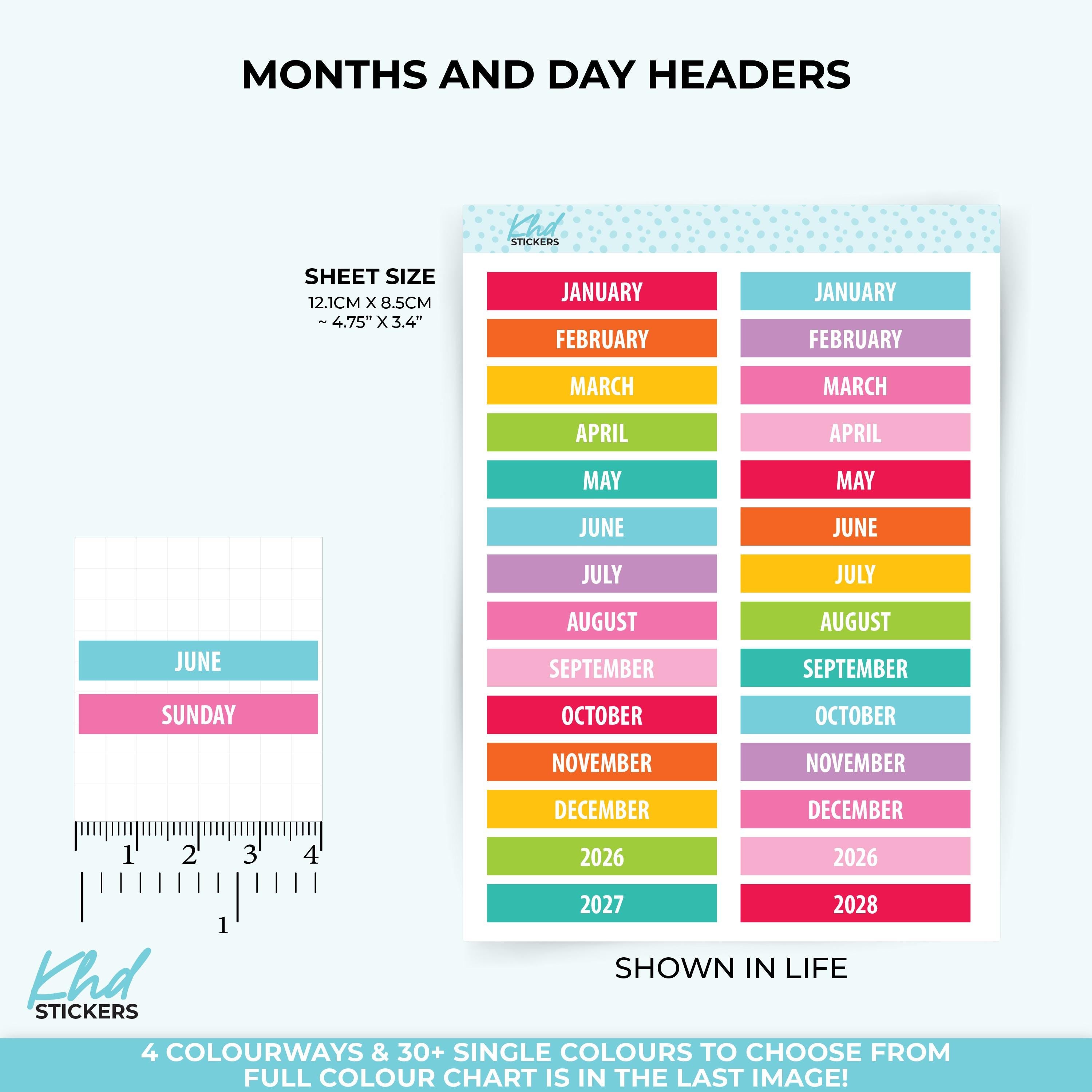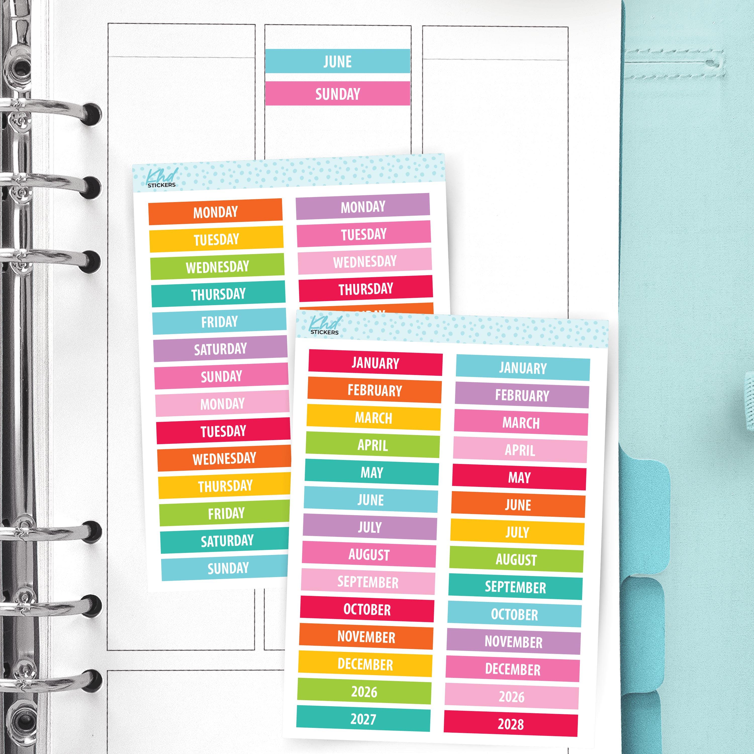 Months of the year bright and colourful stickers or perhaps select days of the week, with 2 years of headers.