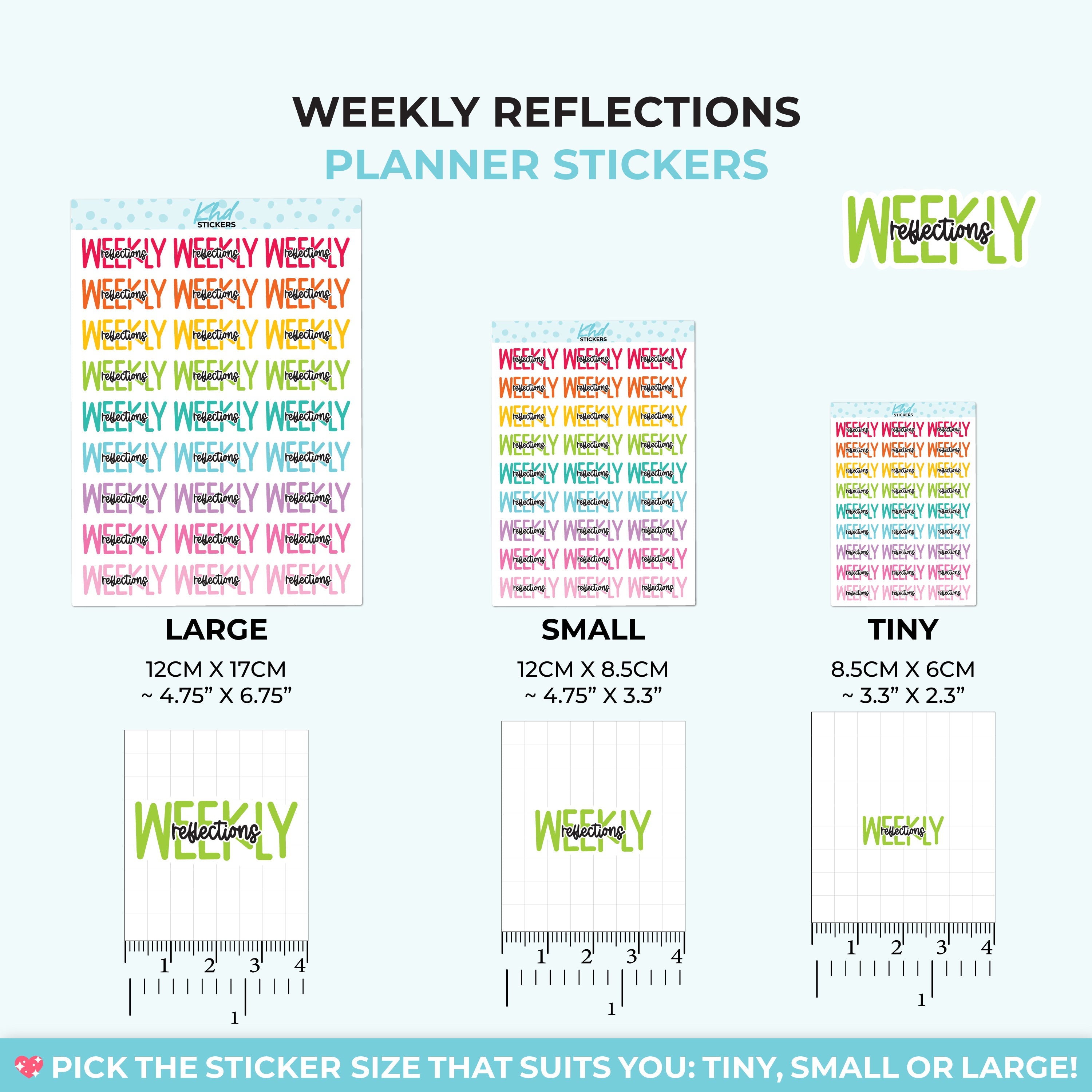 Weekly Reflections Planner Stickers in three sizes and 35 colourways. Removable, smooth-matte finish.