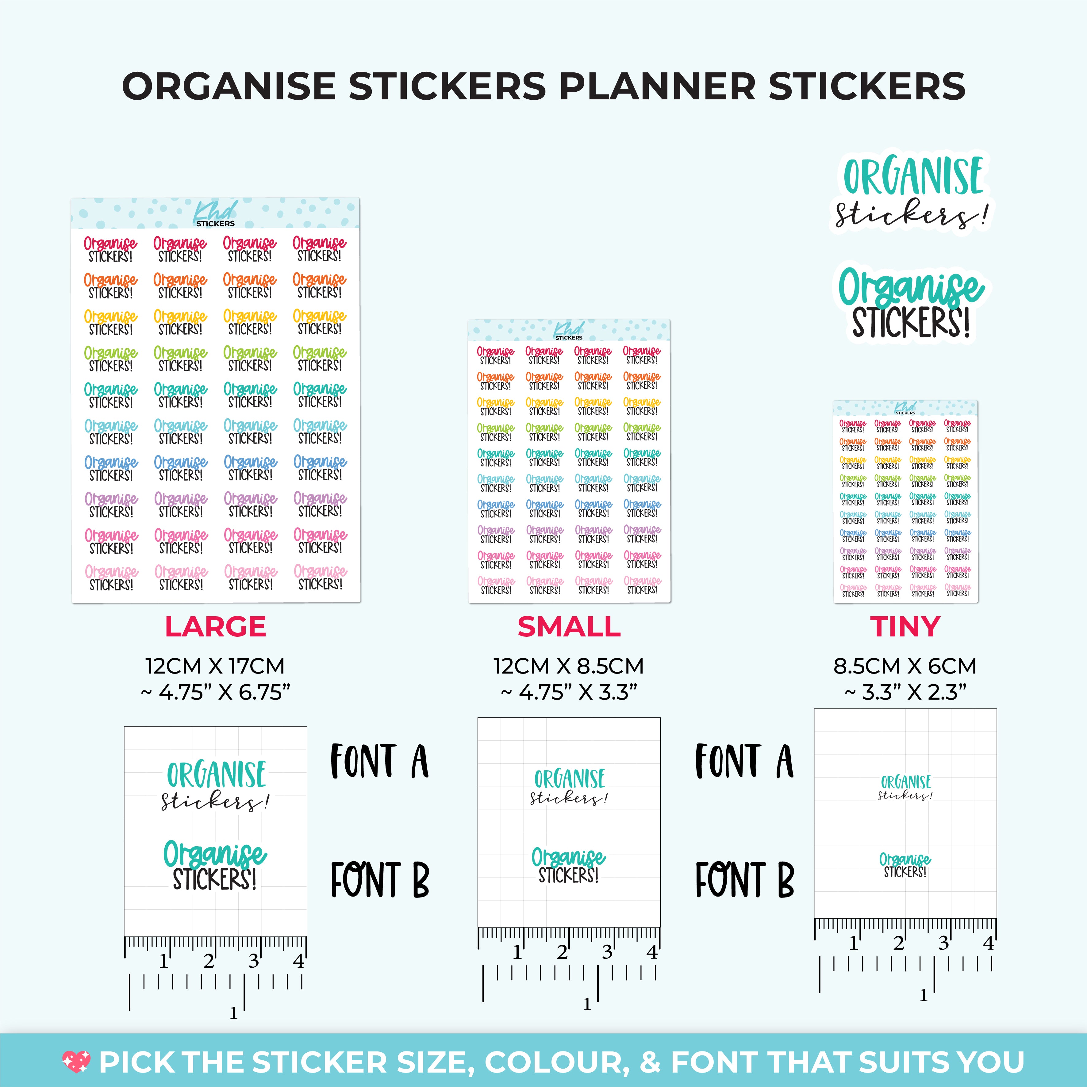 Organise Stickers! Planner Stickers. Select from one of 4 colourways, or select a sheet of your favourite colour. Available in three great sizes making it easy to match your planning style.