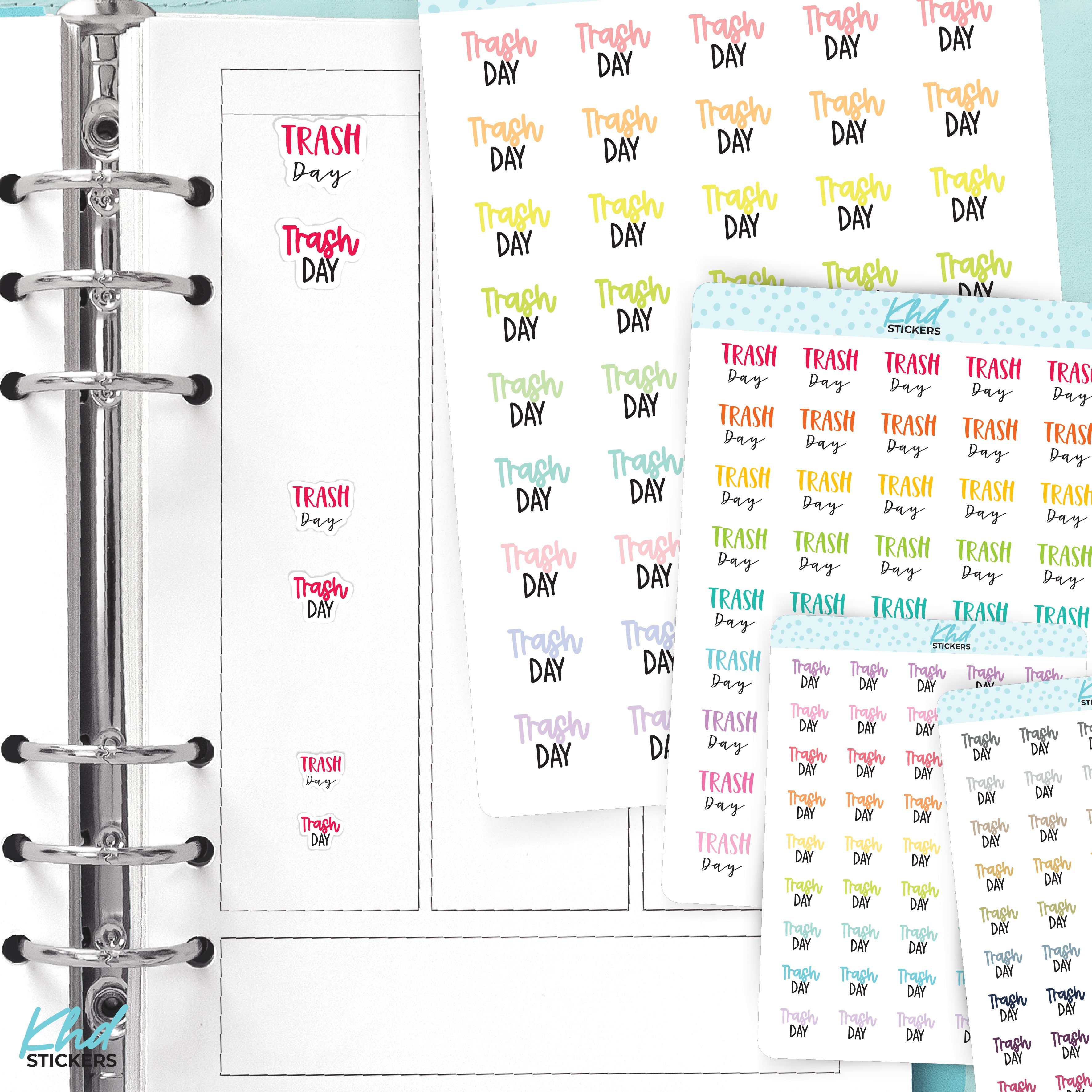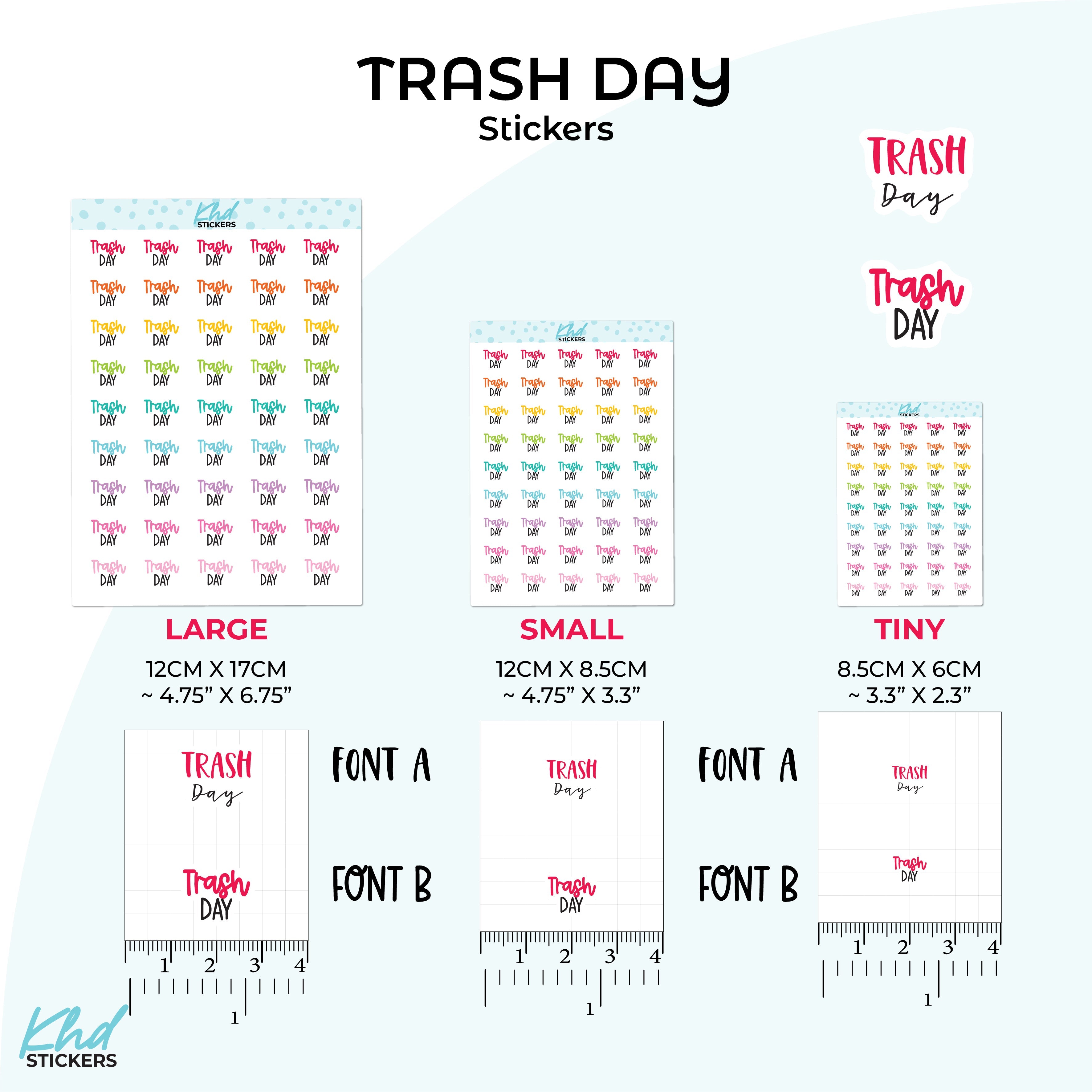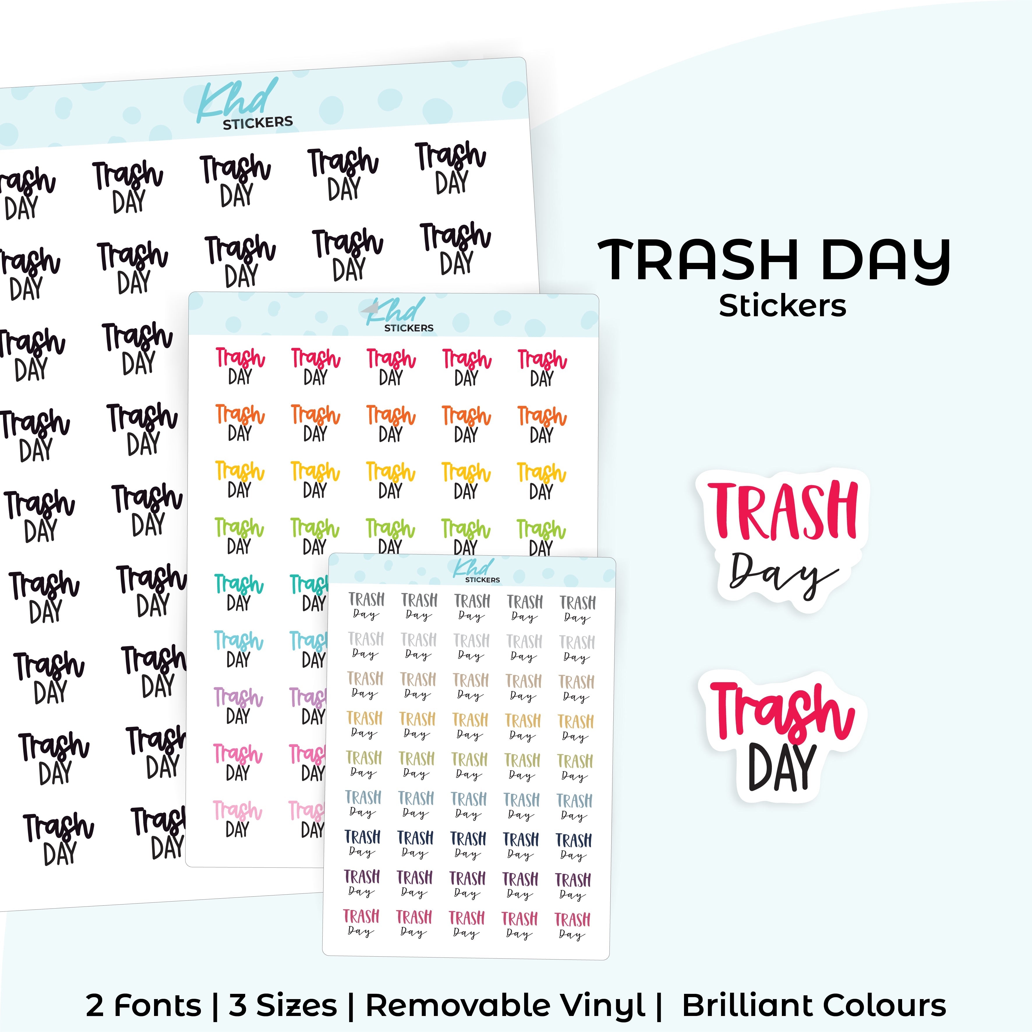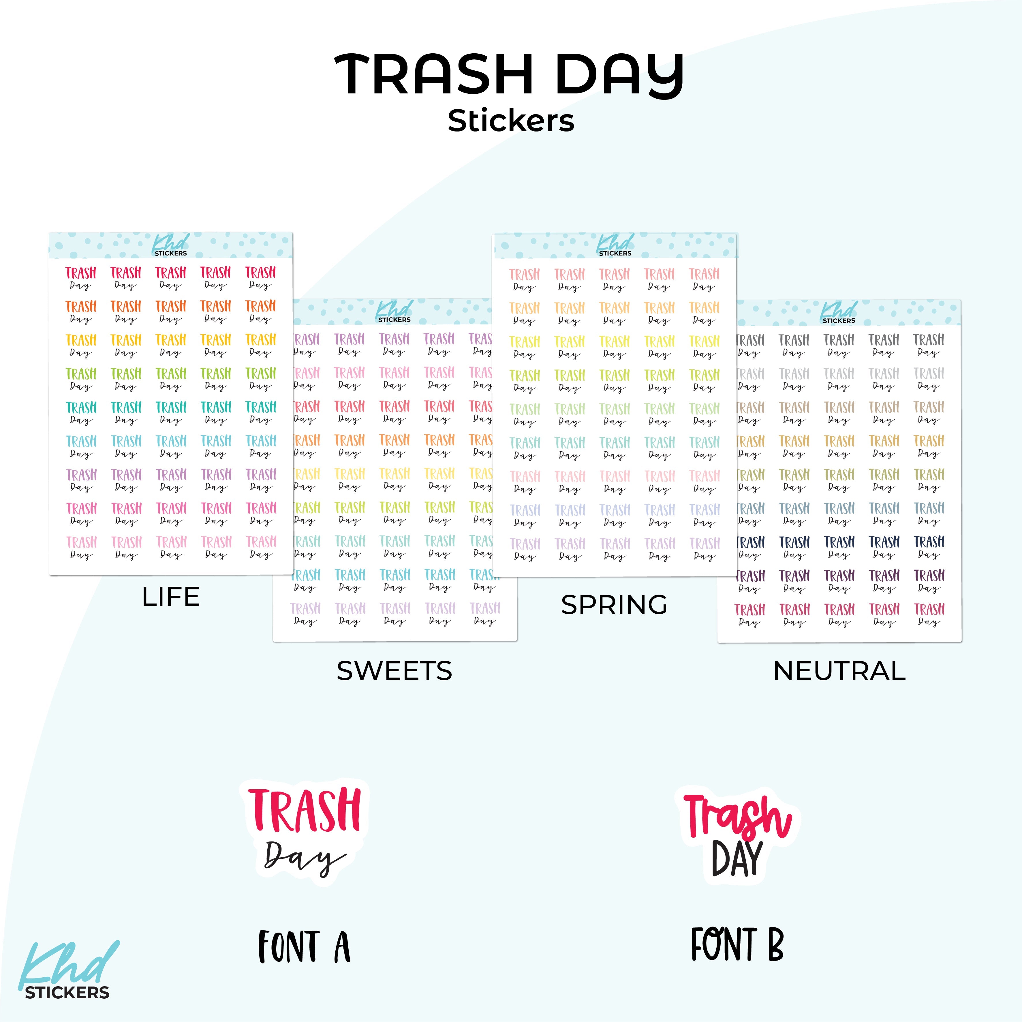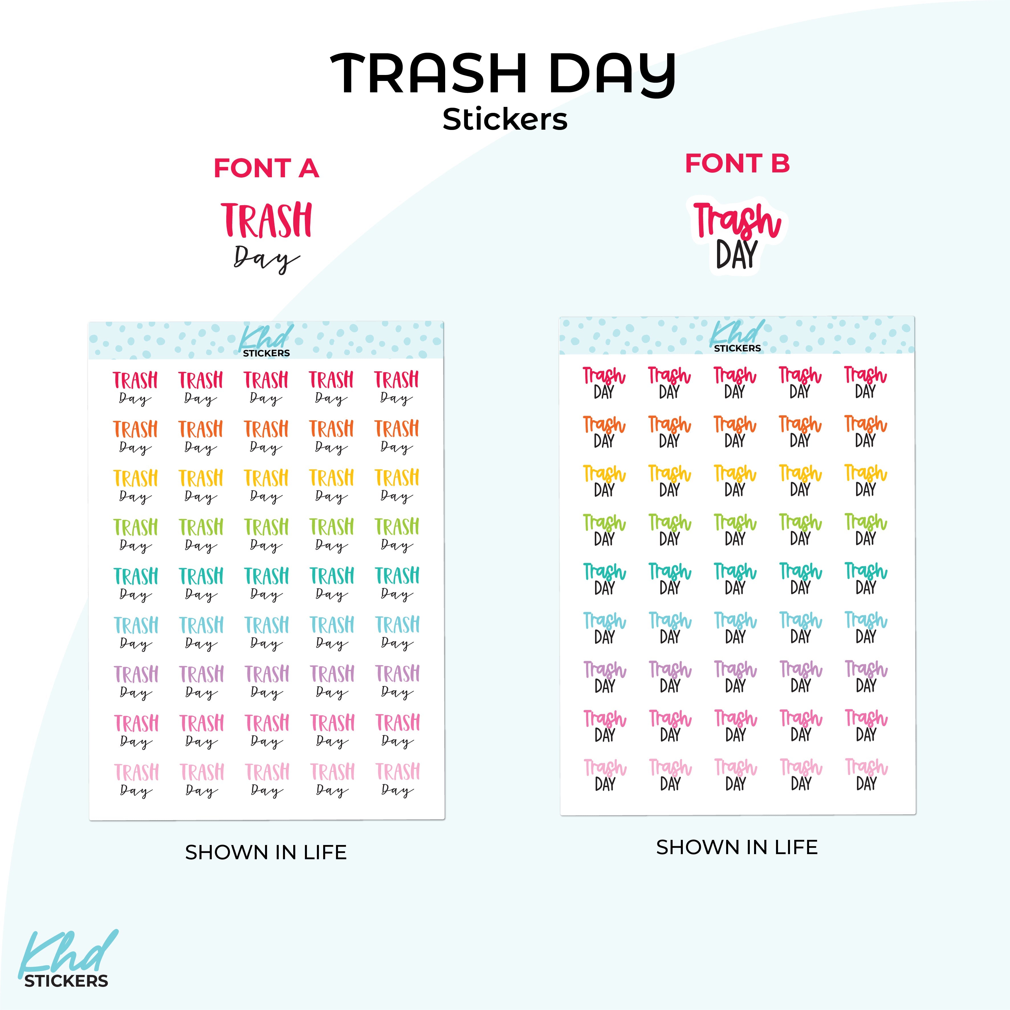 Keep your weekly routine organised with clear trash day reminders. Simple and functional for any planner. Two font styles available.