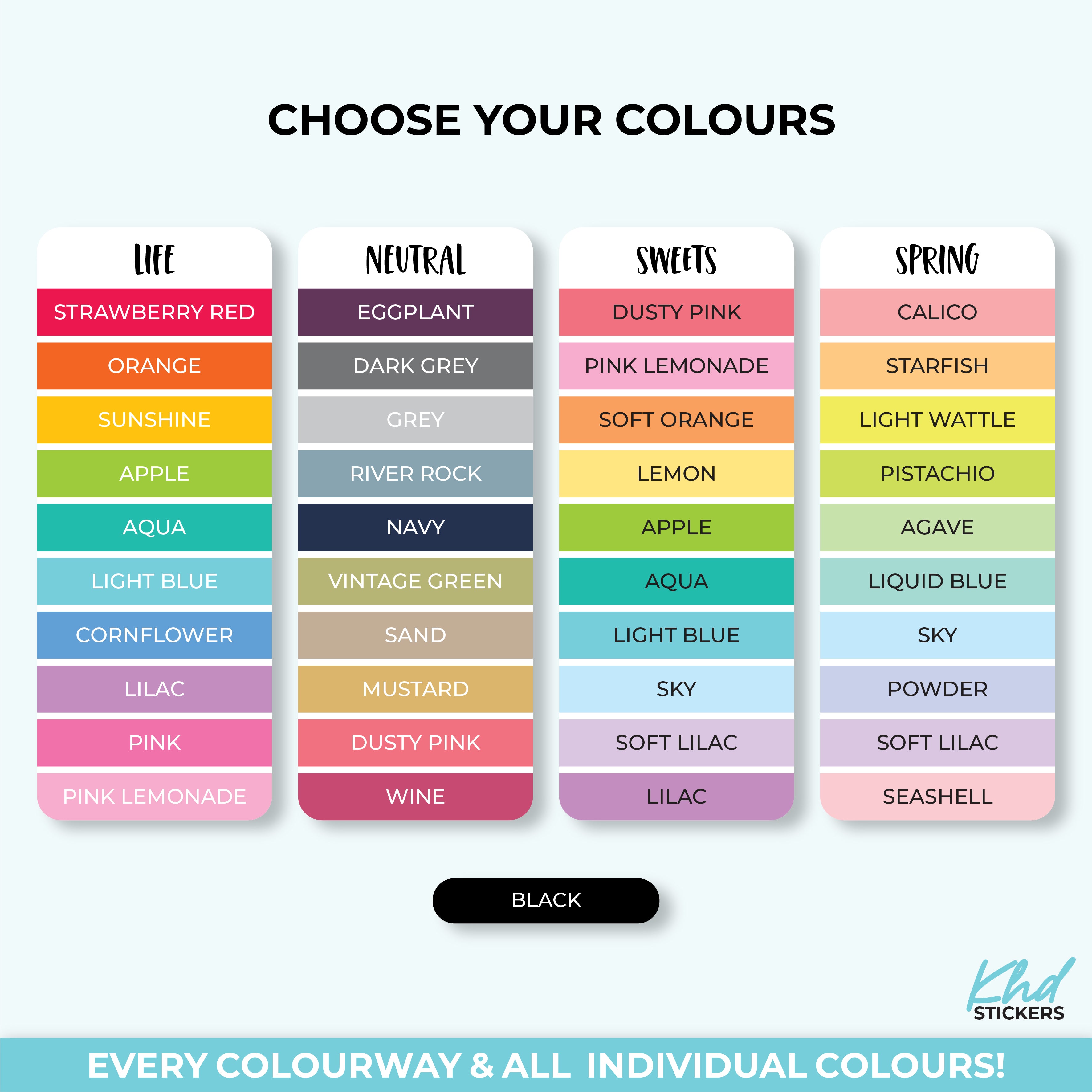 Action Plan Planner Stickers. Select from one of 4 colourways, or select a sheet of your favourite colour. Available in three great sizes making it easy to match your planning style.