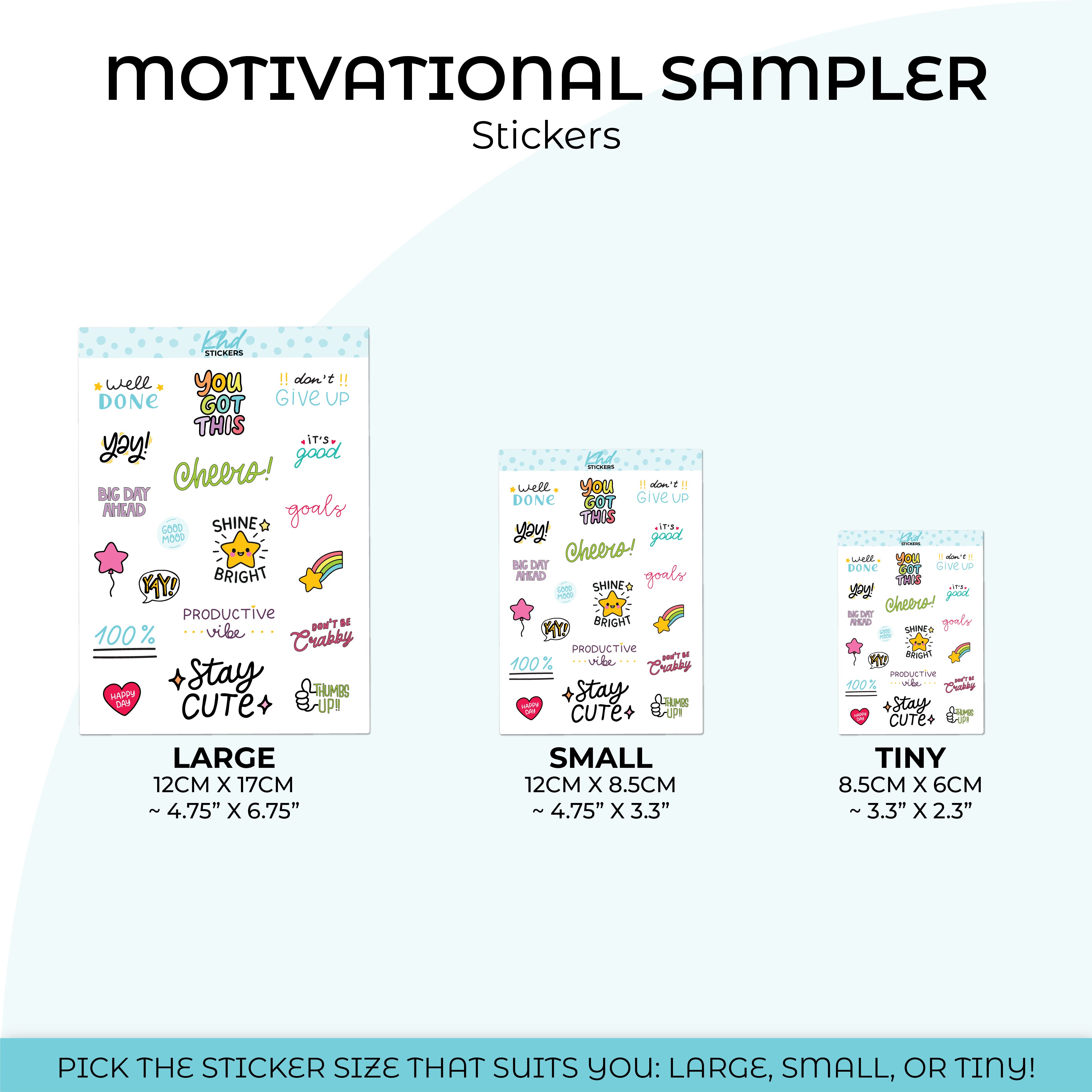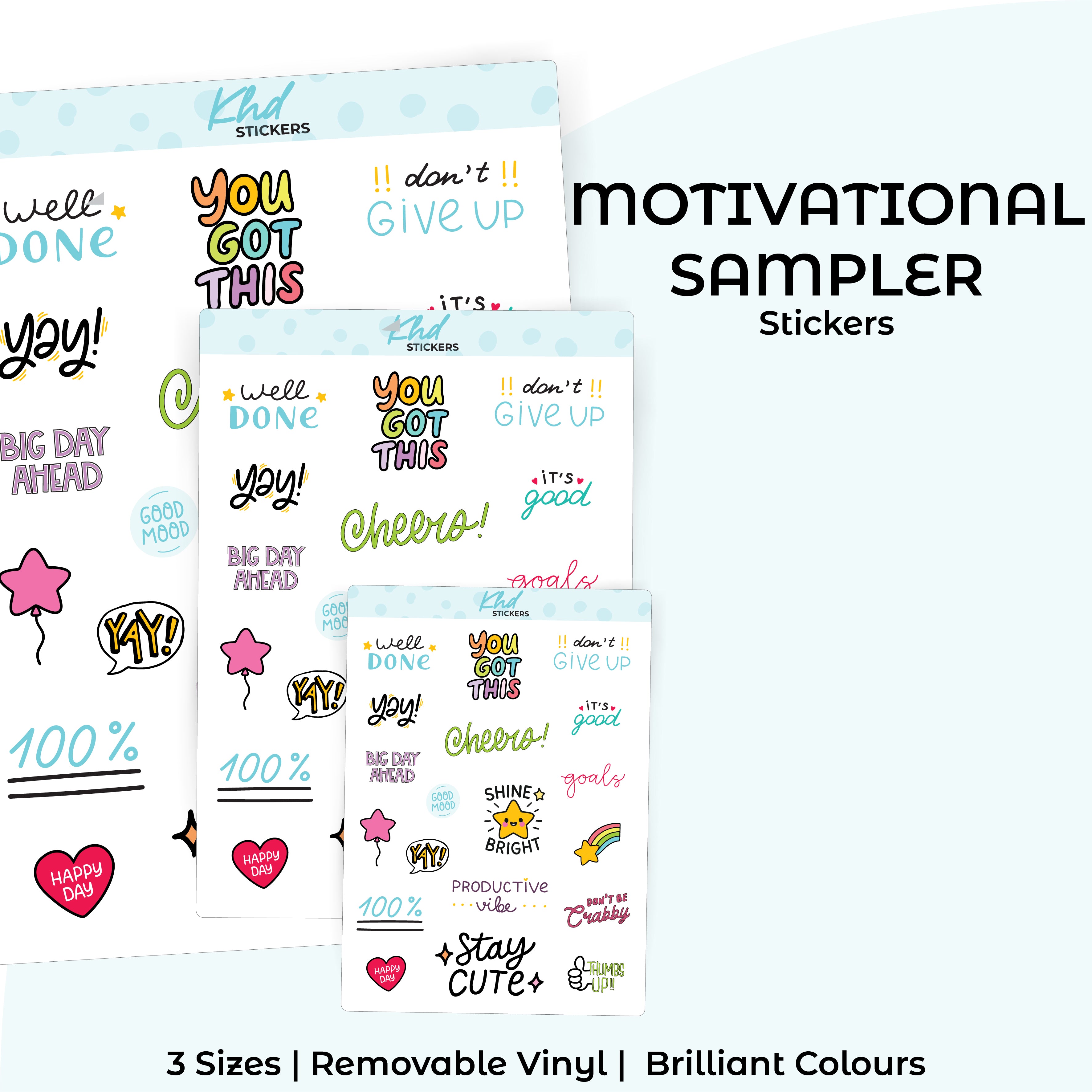 A fun sampler Motivational Sticker sheet featuring a range of top selling stickers from KHD. Select from three different sheet sizes.