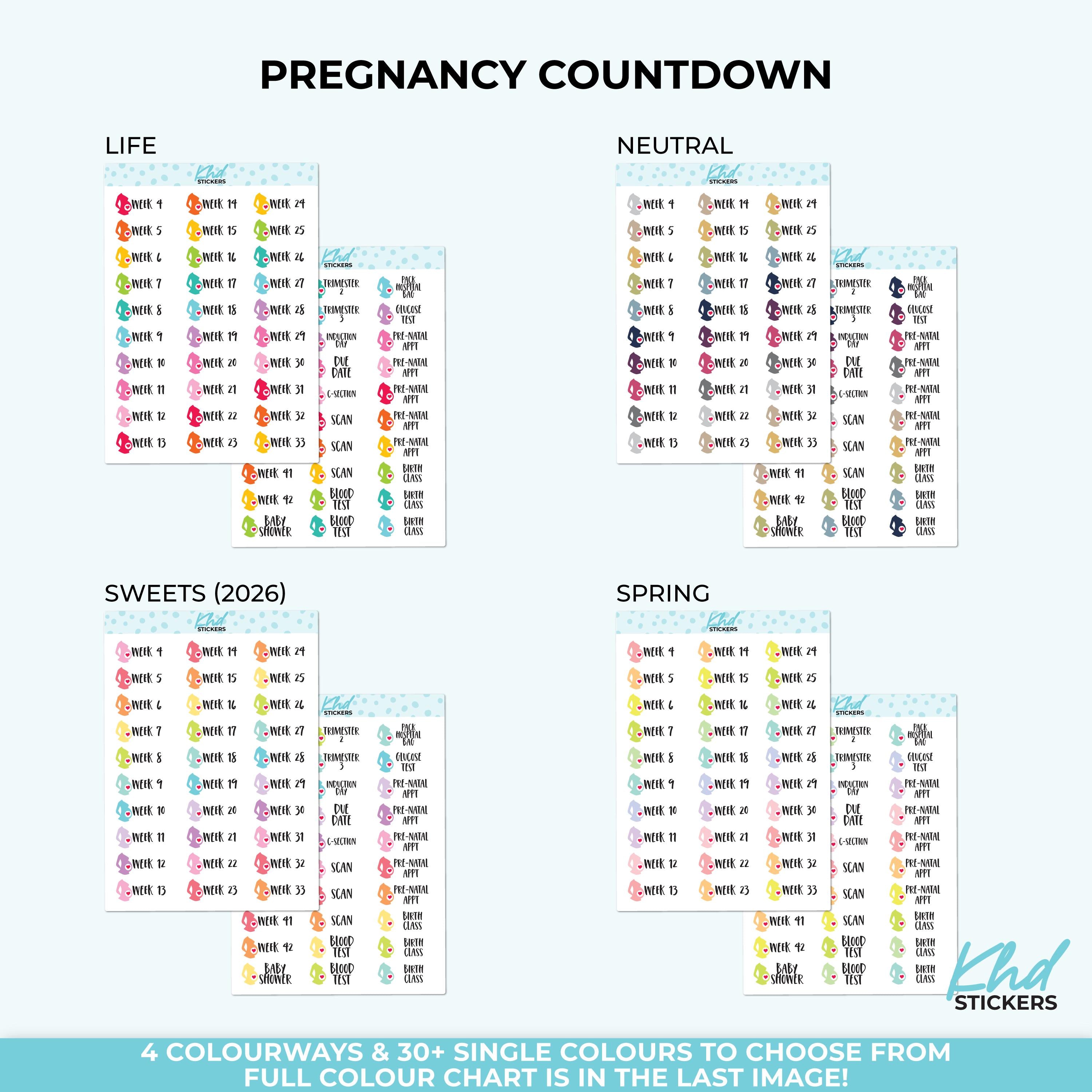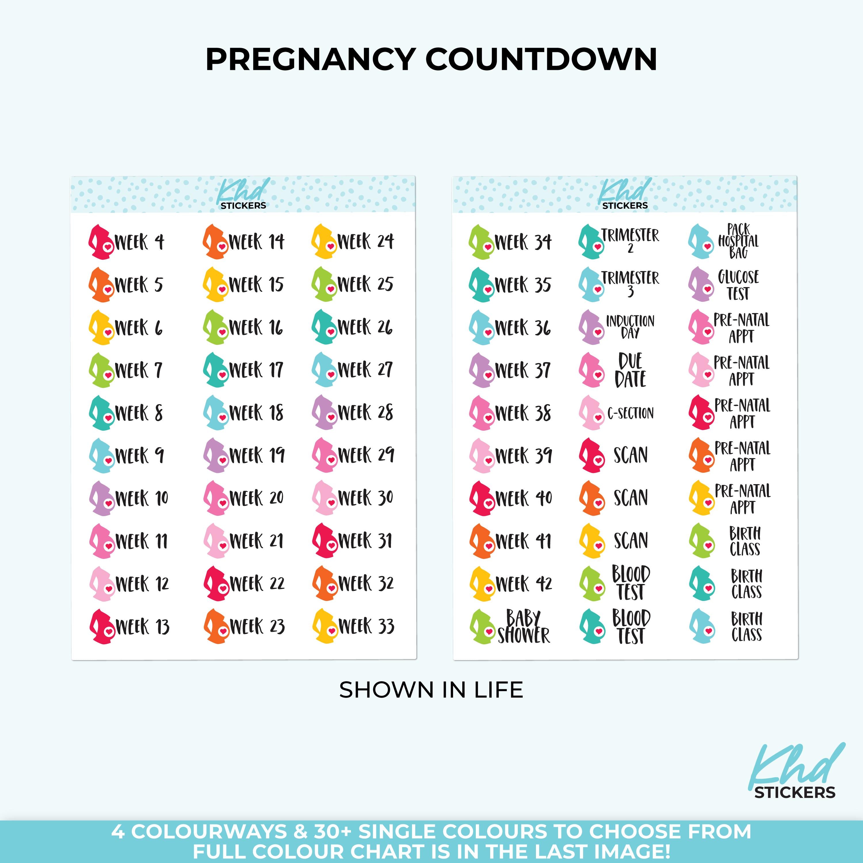 Countdown to your due date with bright Pregnancy Weeks planner stickers. Includes Weeks 4 to 42, plus Due Date, C-Section, Induction Day, pre-natal appts, and other helpful stickers.