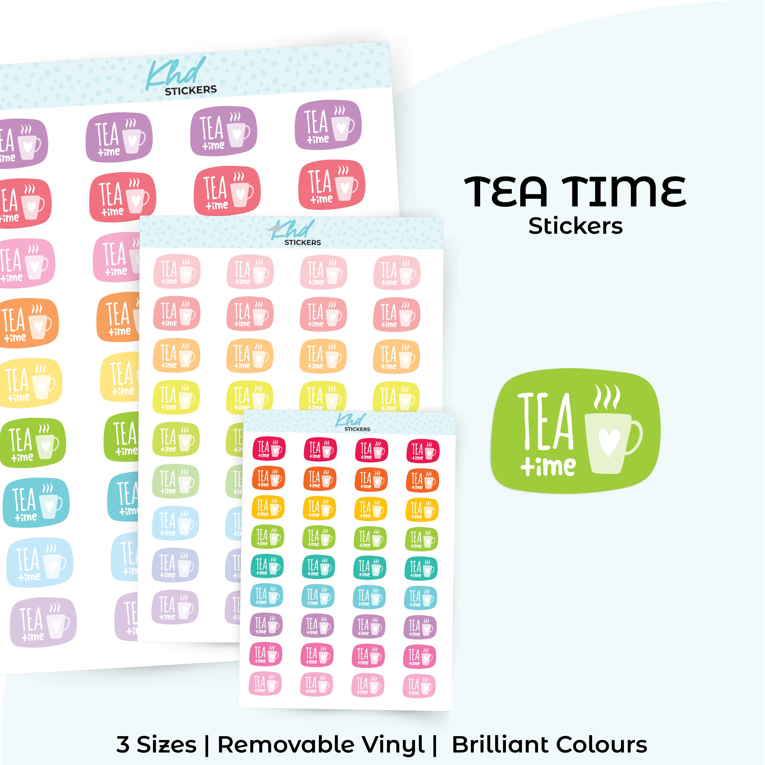 Tea Time Planner Stickers. Select from one of 4 colourways, or select a sheet of your favourite colour. Available in three great sizes making it easy to match your planning style.