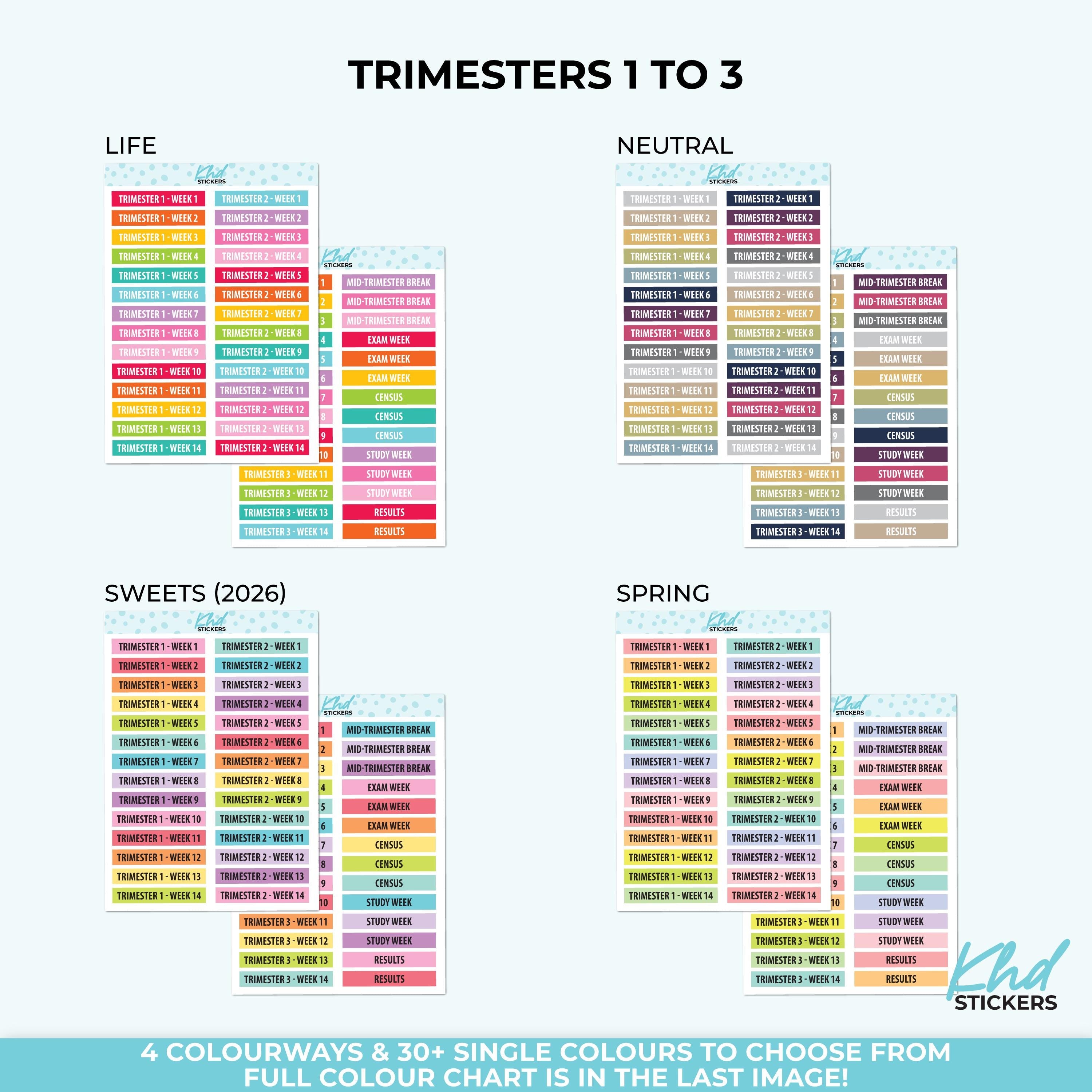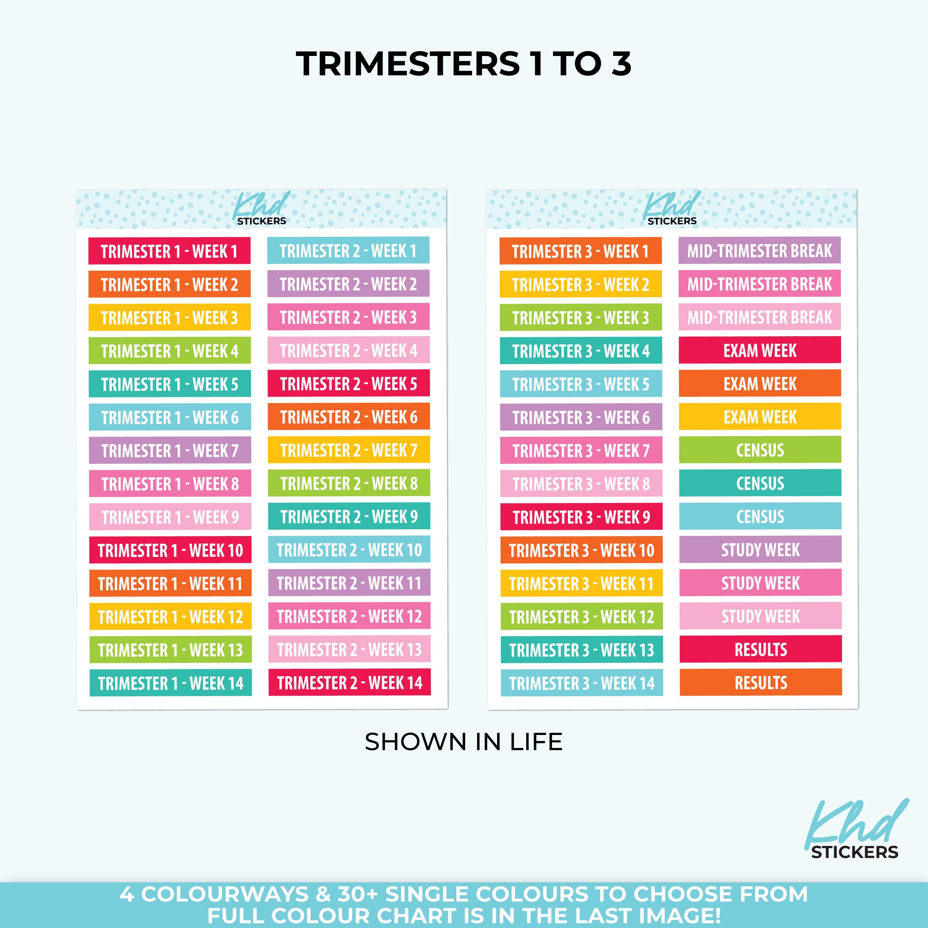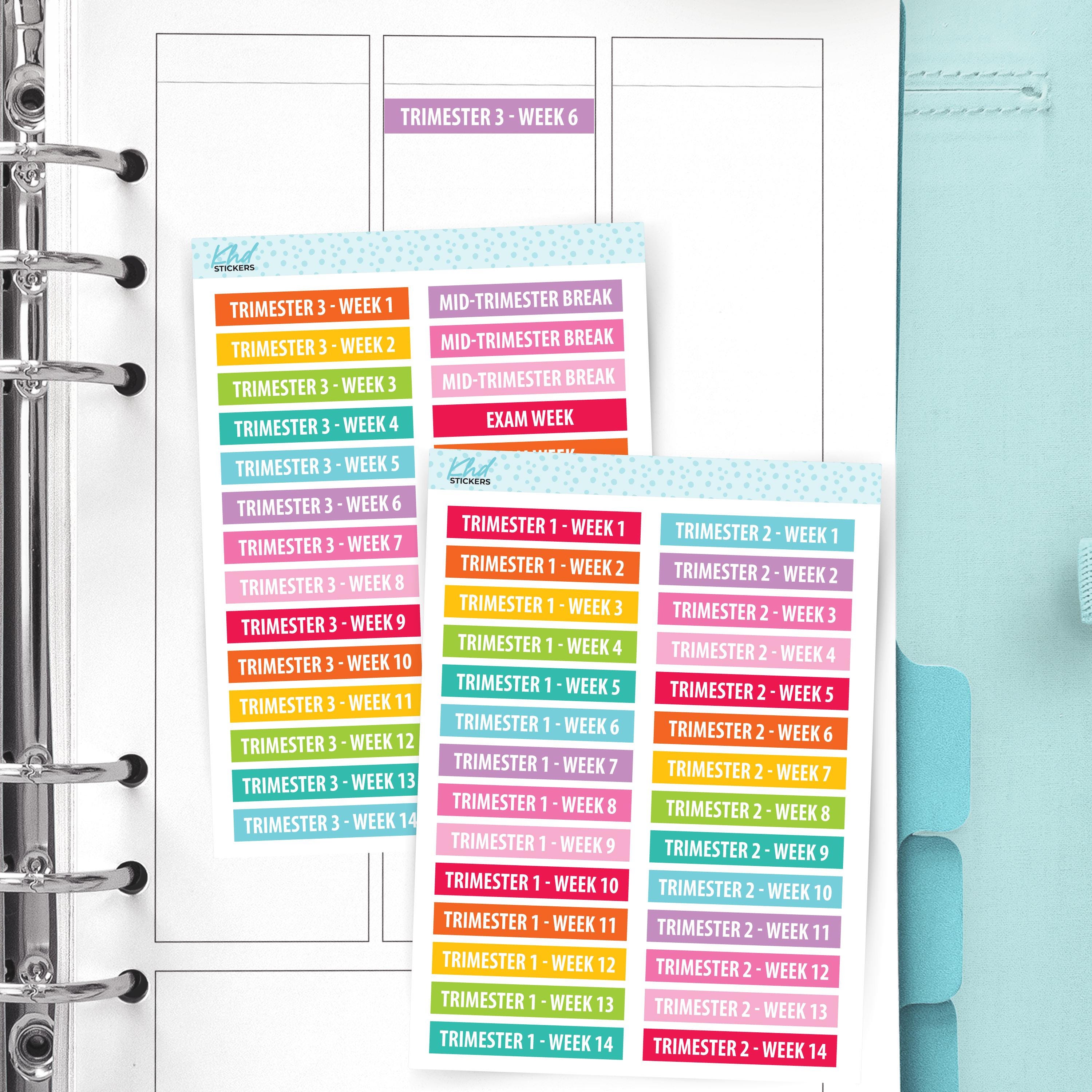 Keep organised at school or uni and mark each week of the trimester using these stickers. Semesters 1 to 3, each with weeks 1 to 14. Plus 14 other stickers useful for university, college or school.
